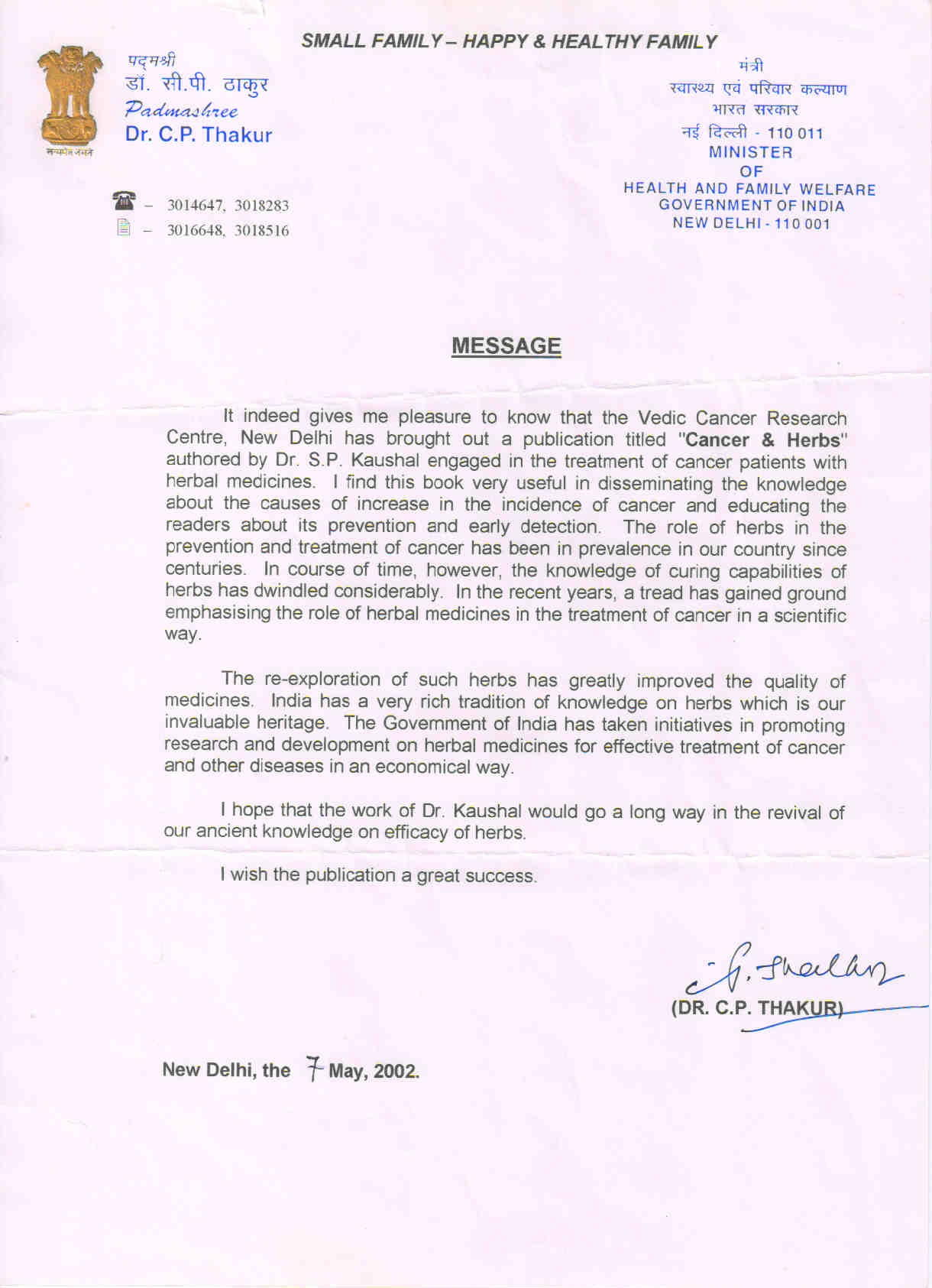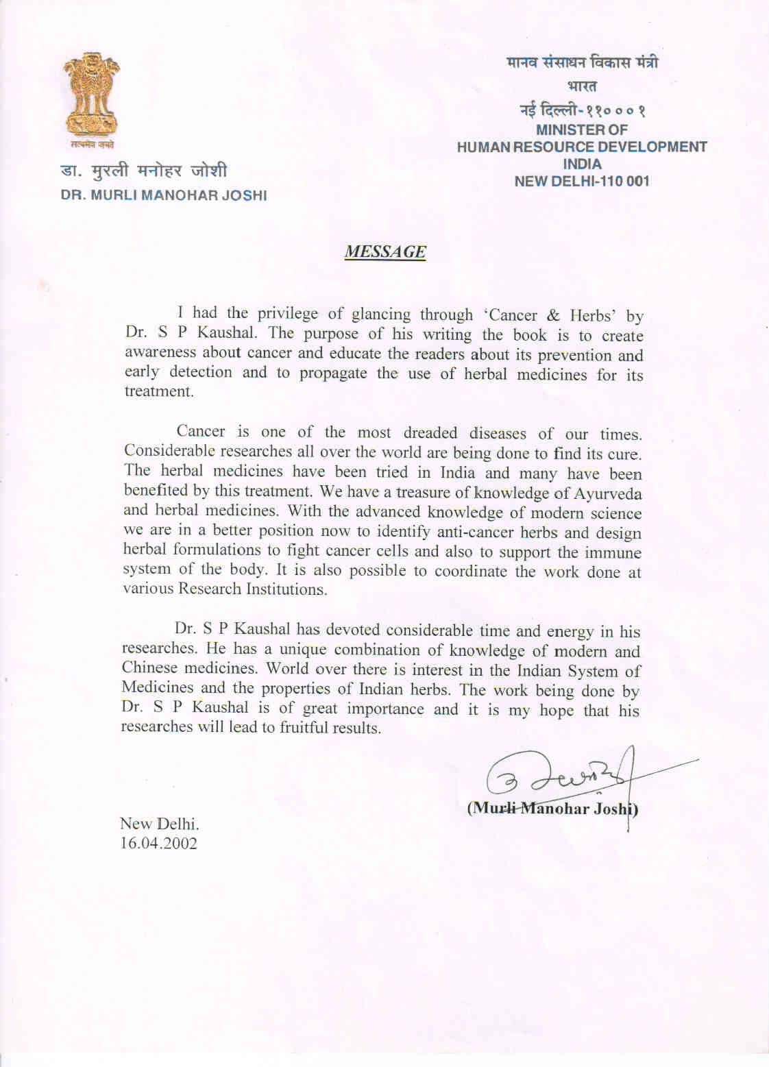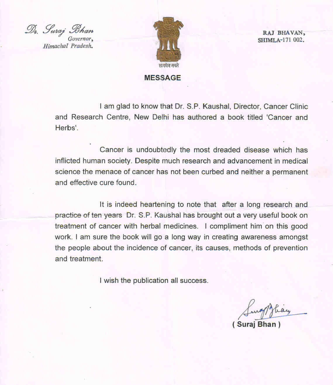 His books “Fight Cancer with Herbs” published in 1999 and “Cancer & Herbs” published in 2003 have been acclaimed worldwide. Dr. S.P. Kaushal formulated various herbal and ayurvedic formulations such as Oncotame, Oncotame Plus, Oncotame-S , Cancertame, Immunotone & Immunotone Plus for the treatment of cancer patients without side effects. These herbal formulations not only help to control the growth & spread of cancer but also helps to reduce the side effects of chemotherapy, radiotherapy, immunotherapy & hormone therapy.