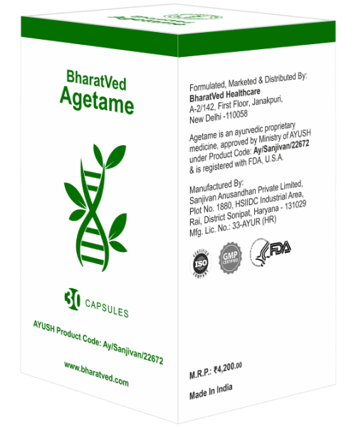 Agetame is an Ayurvedic formulation that helps to slow down/reverse ageing. Every BharatVed OTC product is duly approved by the Ministry of AYUSH, proving its efficacy & showing that the product has undergone a proper clinical trial. BharatVed Agetame was approved for manufacturing under Drug Manufacturing Licence No. 33-Ayur-(HR) on 19/04/2021 under product code AY/Sanjivan/22672.